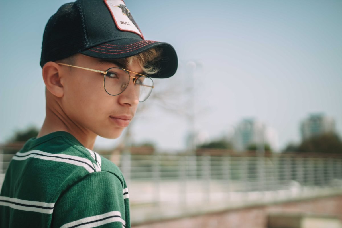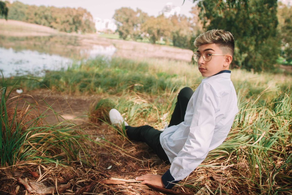 הנער שוכב על השרכים ואני מצלם ממבט של ציפור- צילום תקריב מלמעלה, תופס את מבט עיניו מבעד למשקפיים, תופס את החיבור בין הטבע והגוף