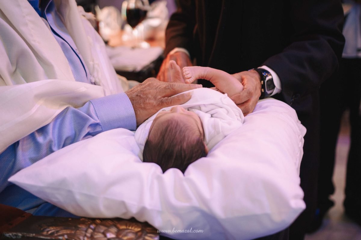 המוהל נותן הוראות הבית כיצד לטפל במקום החיתוך ואני מצלם תמונות סטילס של התינוק עם הסנדק עם כמה מהאורחים שביקשו להצטלם עם התינוק
