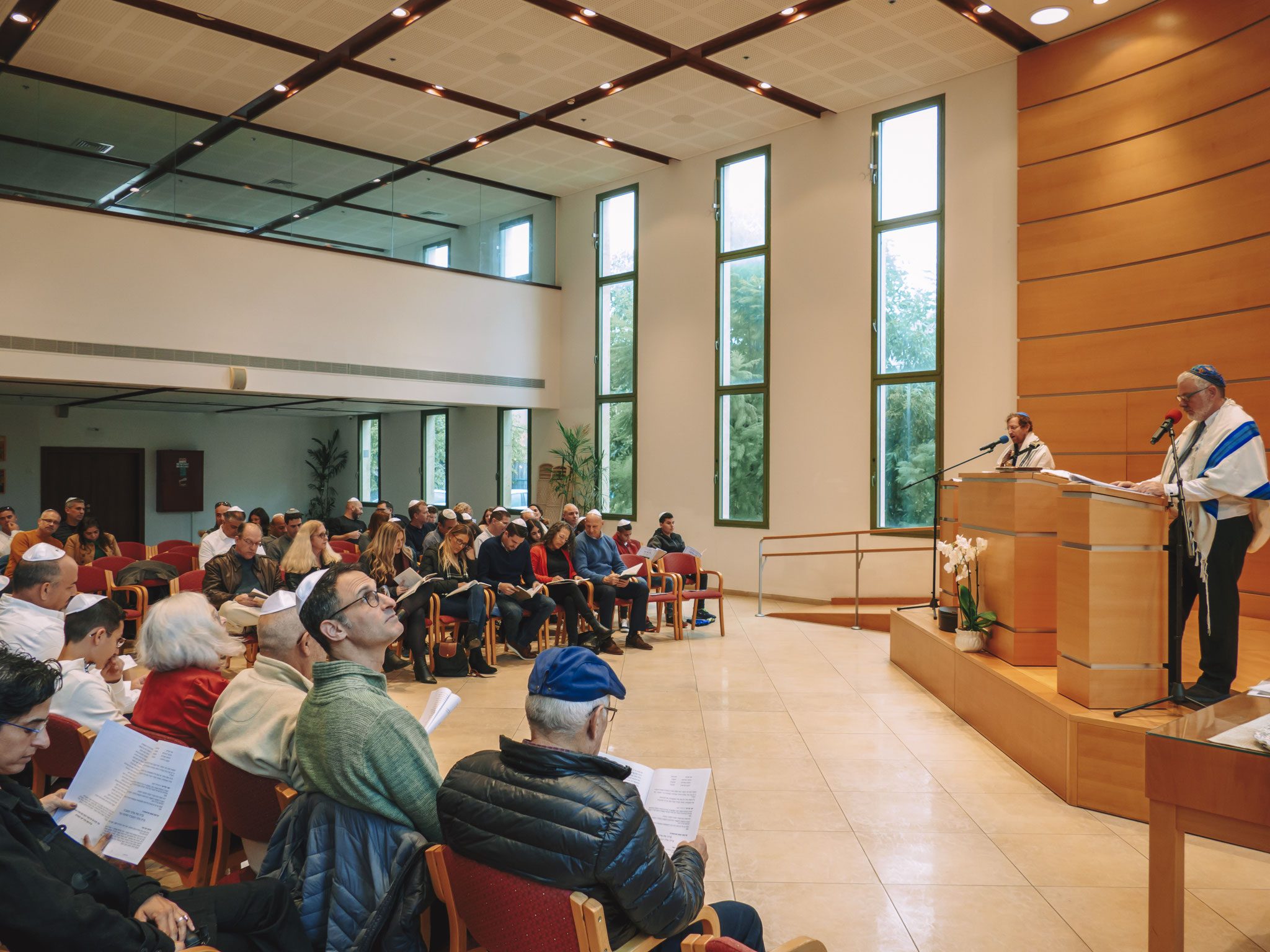 הבמה מעץ והקיר בו נמצא ספר התורה גם מעץ נותנים תחושת יוקרה אך בעדינות, לא מנקרים עיניים וזה ממש משתלב טוב לתמונות וגם וידאו