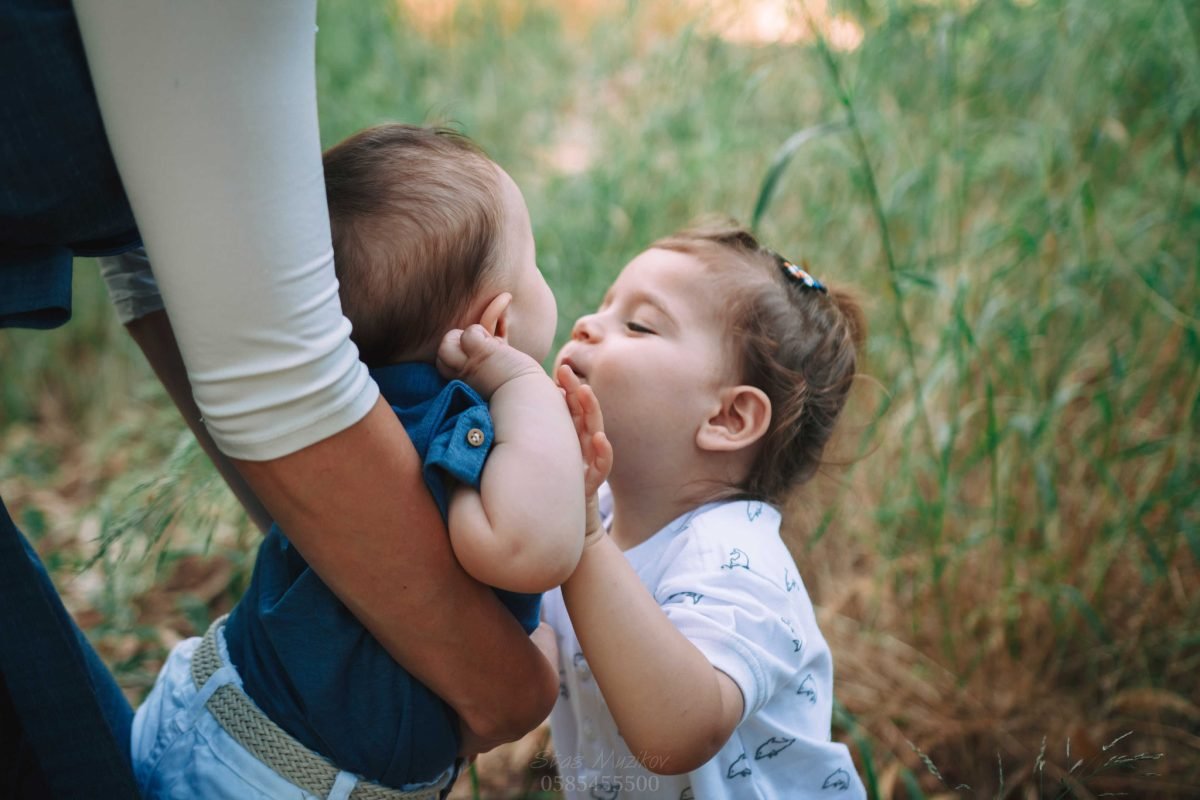בניגוד לתמונה זו, החלטתי שהתמונה הבאה תיעשה בטבעיות. ההורים משחקים עם הילדים בטבע, השקפתי מהצד, ובחרתי לתפוס את רגע השיא, הרגע המרגש בו האם מקרבת את הילד הקטן לאחיו והוא האח מקבל את הקטן לחיקו
