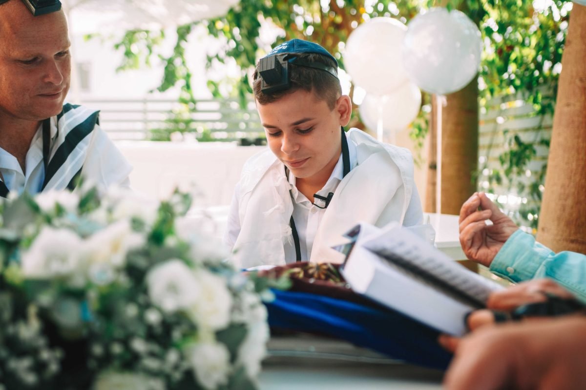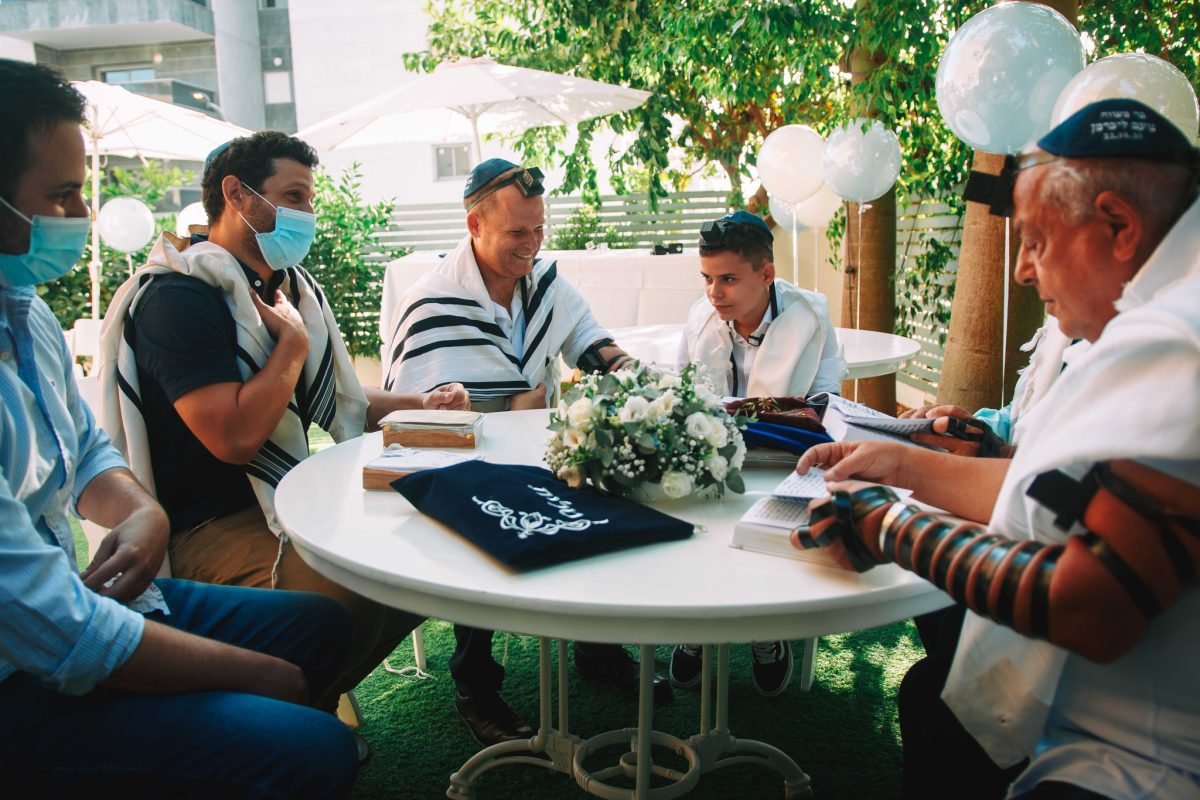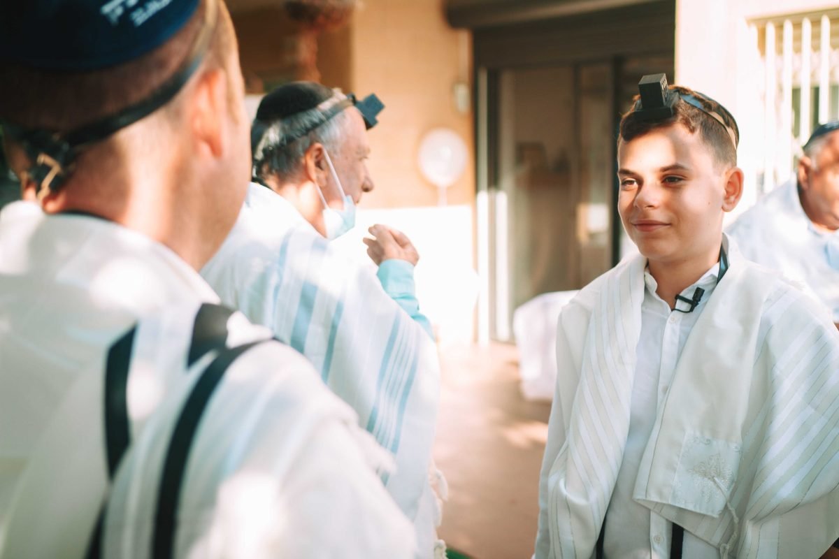 היום אני אספר לכם על עלייה לתורה בבית בגדרה שזכיתי לתעד. תחילה אספר שכשנכנסתי לבית, הרגשתי כמו בבית דאגו לגרום לי להרגיש בנוח למרות שהצילום עלייה לתורה כאן הוא לא צילום שגרתי, כשאתה נכנס לבית של בן אדם אתה נכנס למקום הפרטי ביותר שלו, כבר מהכניסה הרגשתי חום מהמשפחה, משם הגעתי לחצר הבית שבה התרחש טקס העלייה לתורה. קודם כל אני מבטיח לכם שמה שראו עיני יכול לבייש אולם אירועים יוקרתי, ההשקעה הייתה ניכרת. הדבר הבולט הראשון הוא כמות הפרחים שהיו בחצר, סידורי פרחים מושקעים שדומים פחות או יותר לזרים באירועים מושקעים ומעלה, דאגו לבלונים מעוצבים שרואים שהם חלק מן סידור בלונים מיוחד, שקישטו את החצר. את השולחנות מסביב כיסו מפות לבנות, כשעל אחד השולחנות היו מוכנים האביזרים לאירוע ביניהם: תפילין מהודרים, טלית וספרי תורה במיוחד לעלייה. כלל האורחים לבשו לבן, והתהדרו בכיפה ממותגת לאירוע. אפשר היה לראות שגם הטליות היו מיוחדות. כלל האורחים היו עם מסיכות לאור הקורונה, שלא שברה אותם, אולי הסוכריות טיפה, בכל זאת כואב שזורקים סוכריות