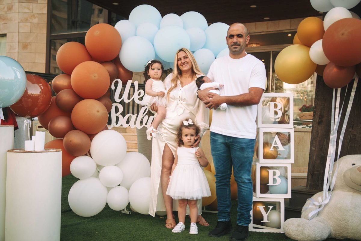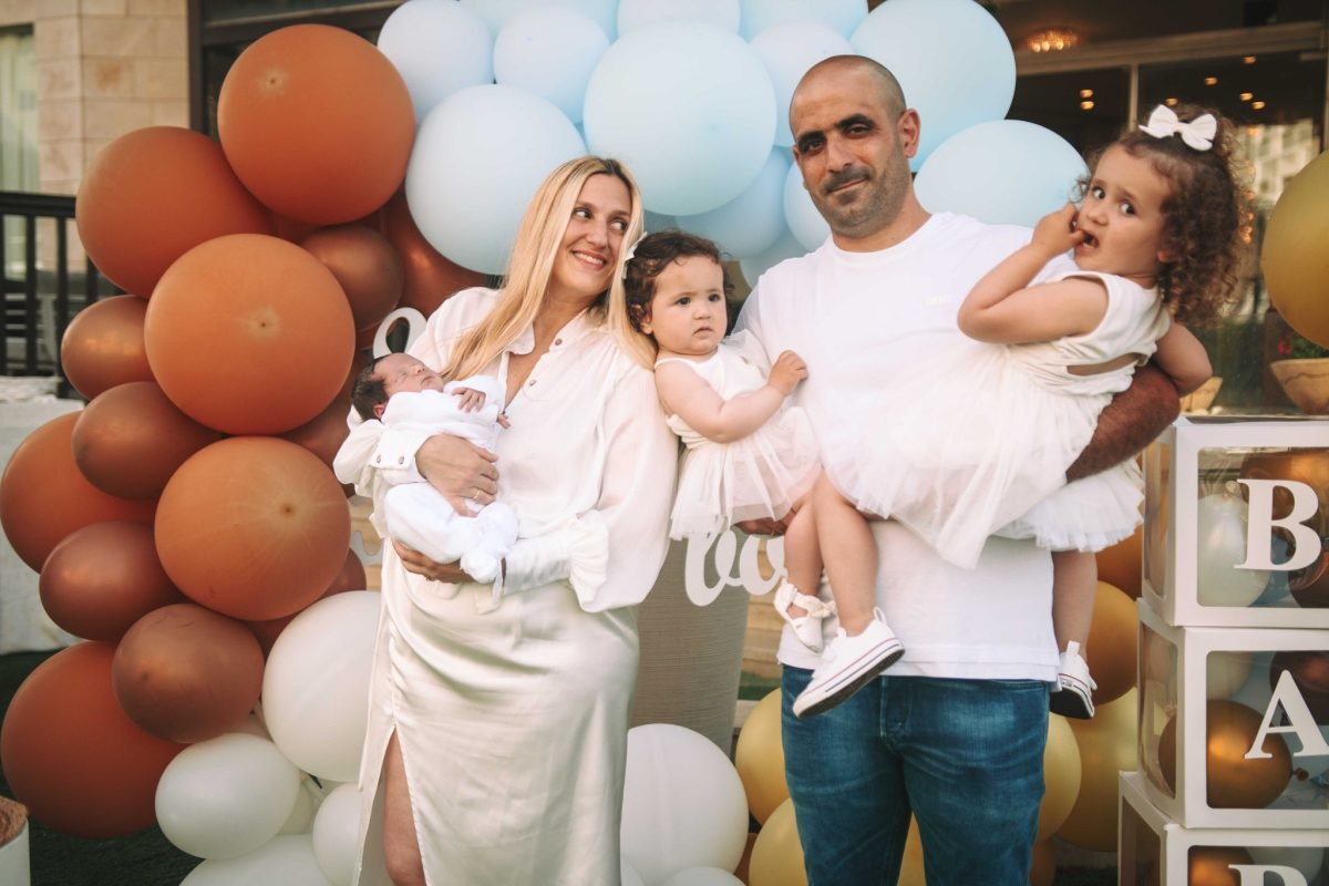 ועכשיו לתמונה שאני אישית הכי אוהב. תמונה מרגשת האבא והאמא בעמדת הבלונים רק שניהם והרך הנולד, הם אוחזים זו משני הצדדים. תמונה המשקפת את משמעות האירוע המשמח. חיים חדשים באו לעולם דרך ההורים. האבא גם ביקש צילומים שלו לבד עם התינוק והבנות