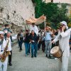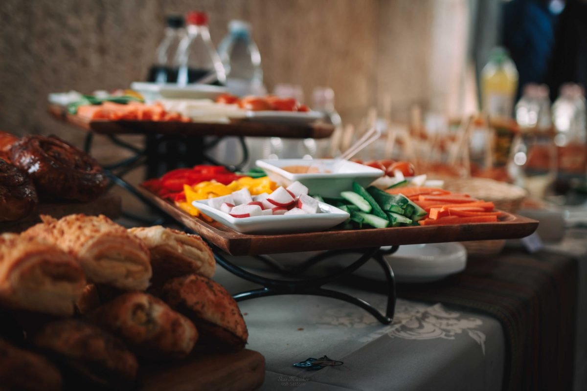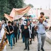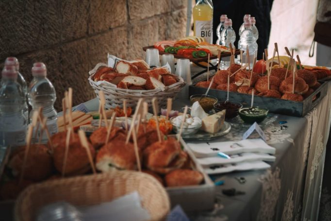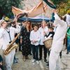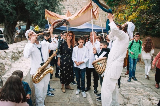 האירוע התחיל כמובן מהפגישה הראשונית של המשפחה עם המוזמנים ברחבת הכותל, מעין קבלת פנים מרגשת אך רגילה לחלוטין שנתפסת כטבעית גם בתמונות. האורחים הונחו לגשת אל בופה שכלל גבינות ומטבלים, בורקסים ממולאים בתפוחי אדמה או גבינות, סנדוויצים קטנים ואישיים, וכמובן שתייה. אחרי ארוחת הבוקר אפשר היה להתקדם ישר לתהלוכת המתופפים המושקעת שכללה זוג נגנים שגם תקעו בשופר, היו לבושים בלבן חגיגי כשאחד מהם מנן על סקסופון והשני על תופים, הנער עמד עם הוריו מתחת ליריעת בד כתומה מהודרת כמעין חופה, ואותם ליוו בשיירה המשפחה והחברים אל הכותל, כשכולם גם לא שוכחים לצהול בשמחה ולרקוד לאור המאורע המרגש, מעין הפוגה בדרך לקריאה בתורה עבור הנער